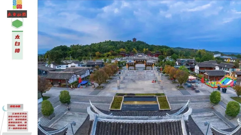 Taibai Tower is located on the top of Tianbao Mountain in the Li Bai Former Residence Scenic Area of Qinglian Town. It is a magnificent Tang-style pavilion, consisting of the main building Taibai Tower, the courtyard corridor and Dapeng Pavilion. Taibai Tower is 33 meters high and has three and a half floors. It is a double-eaved pyramidal roof tower building. The lower part is a heavy platform and the upper part is a square pyramidal roof. The floor plan is in the shape of a crabapple tree, with eaves arranged layer by layer. The entire building is both elegant and ancient, as well as grand and imposing. Standing on the Taibai Tower, one can see a hundred miles of flat fields and the meandering river. As far as the eye can see, in the northwest lies the Taibai Path where the young Li Bai traveled to Kuang Mountain for his studies. The distant mountains of Ziyun Mountain, Xiaokang Mountain and Daokang Mountain are veiled in dark green, while Daitian Mountain is filled with purple mist and rosy clouds.